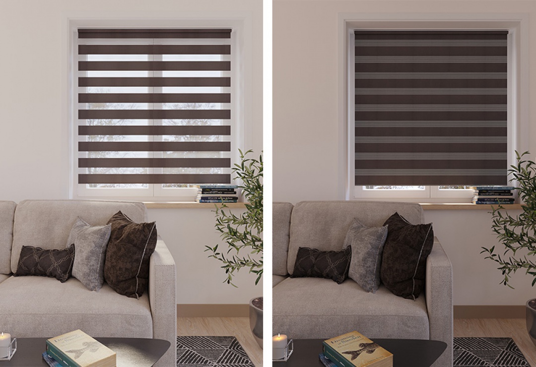 Рулонные шторы "День-Ночь" превосходно защищают от яркого света и бликов днем, а также создают невероятный уют ночью. Рулонные шторы "День-ночь" многофункциональны и имеют 2 режима использования: