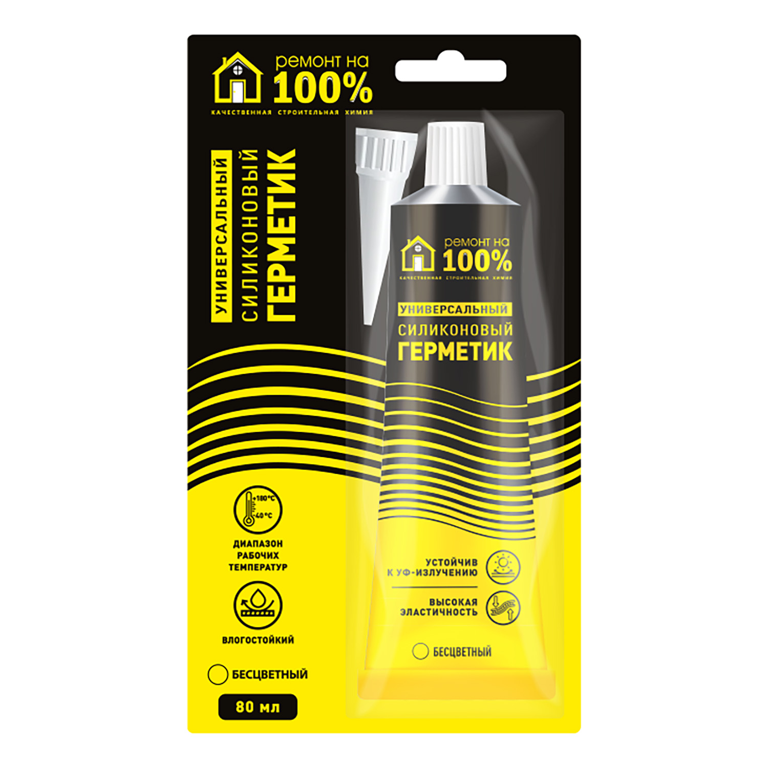 Герметик силиконовый «Ремонт на 100%» бесцветный 80 мл — универсальный силиконовый герметик для широкого спектра строительных и общих ремонтных работ внутри и снаружи помещений. Обладает отличной адгезией к стеклу, дереву, керамике, пластику и т. д. Образует долговечный эластичный, устойчивый к влаге и УФ-лучам шов.