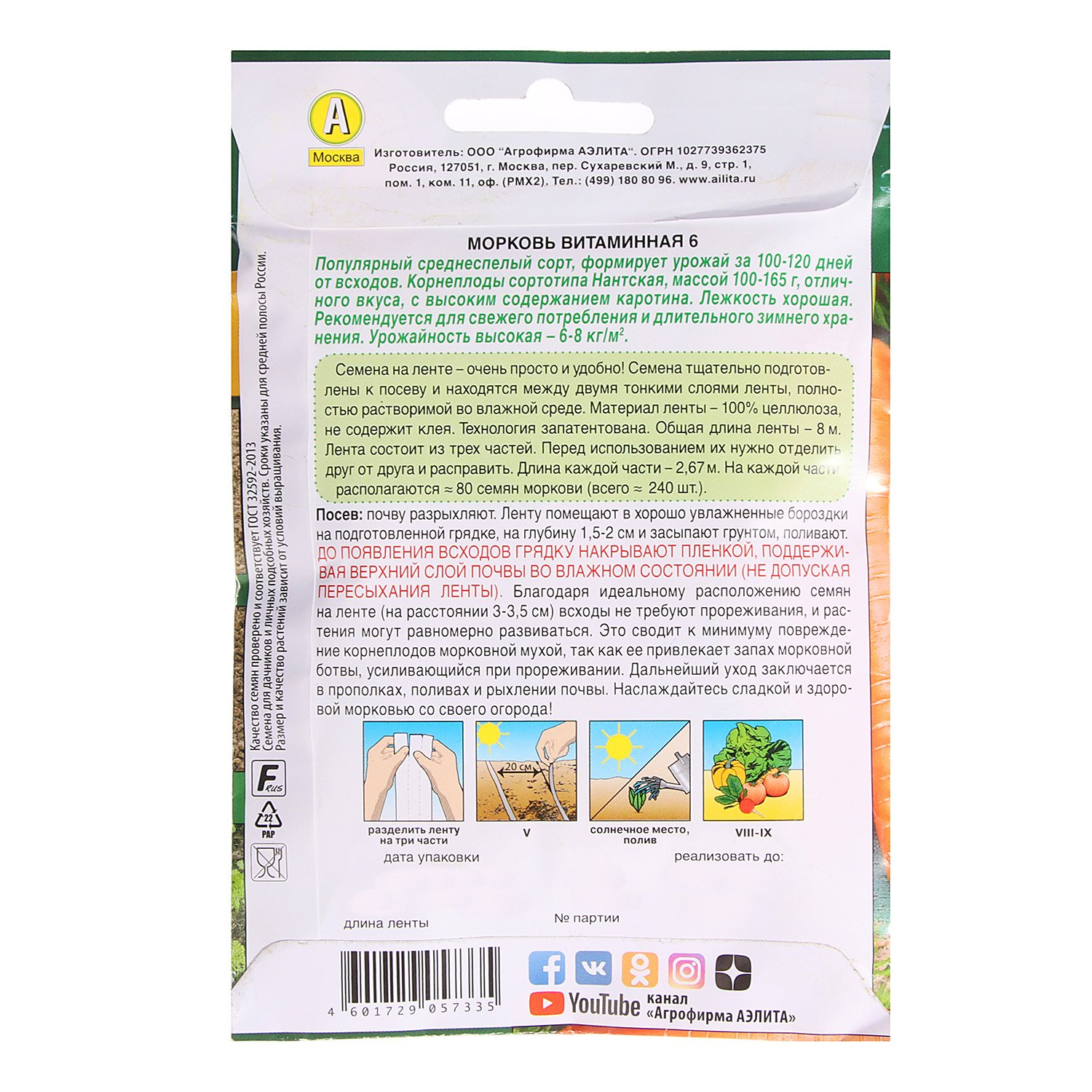 Семена Морковь Витаминная 6 8м ЛЕНТА Аэлита *10/500