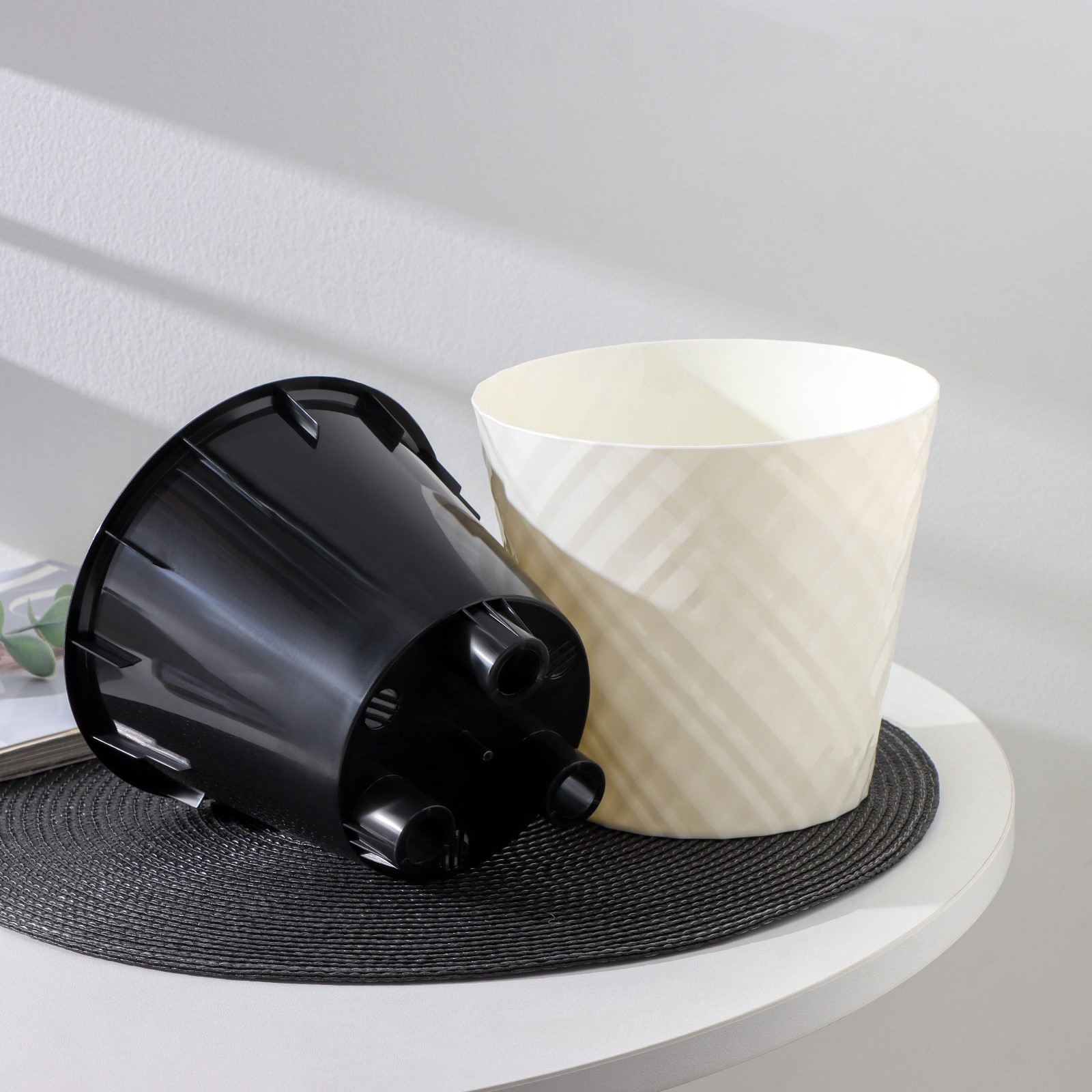 штПоверхность кашпо выполнена вертикальными волнами, сформированными по модели пустынного песка. Горшок укомплектован вкладышем для регулировки в нём воды. Между горшком и вкладышем есть пространство для воды, которая используется растениями при необходимости. Преимущества вкладыша: не нужен поддон, нет необходимости часто поливать цветы, корешки не подвергаются гниению. Материал устойчив к солнечному свету, низким температурам и механическим повреждениям. Кашпо выполнены в природных оттенках: белый, кремовый, серый. Является неповторимой деталью способной украсить и оживить интерьер любого дома.