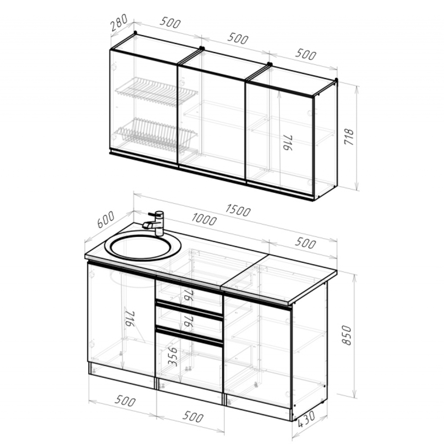 *мойки, смесители и посудосушители в комплекты гарнитуров не входят.