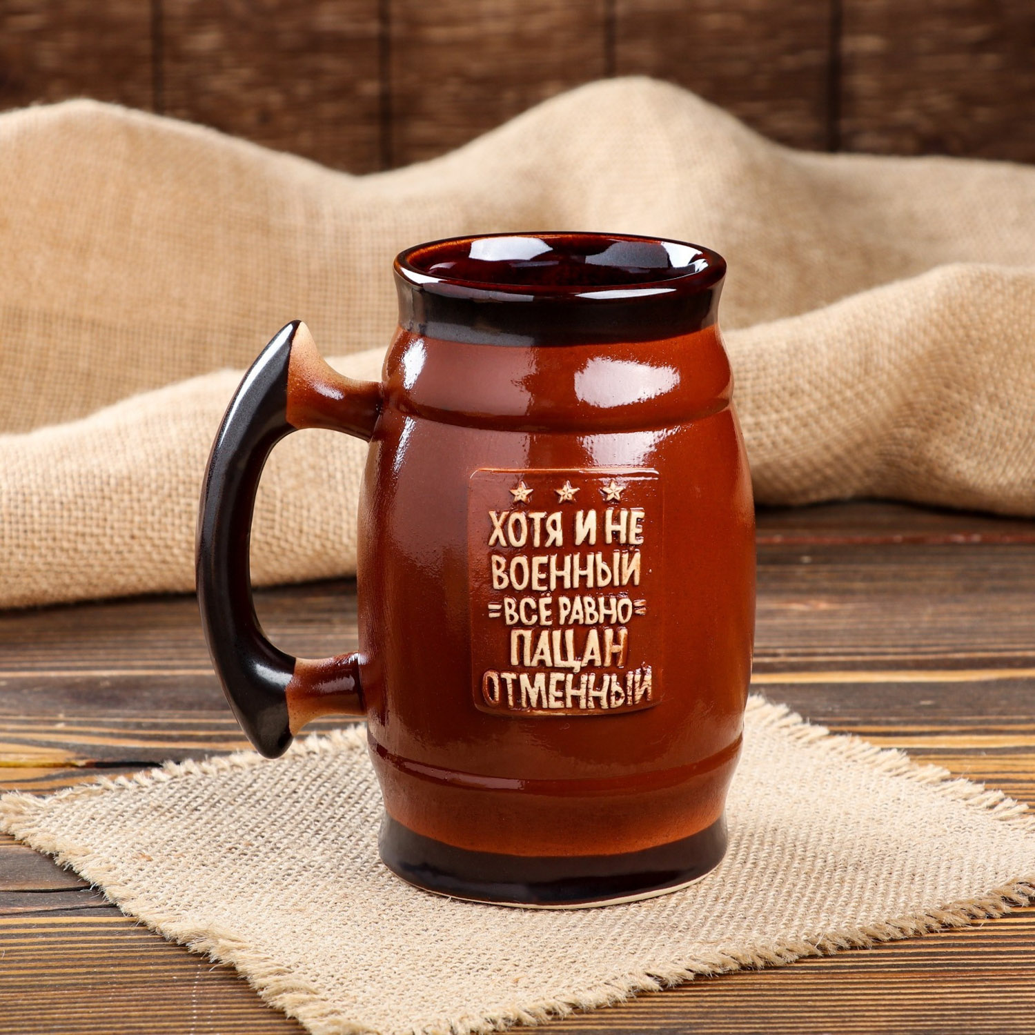 яяяПивной бокал "Хоть и не военный, все равно пацан отменный", тёмно-коричневый, 0.6 л 5456869