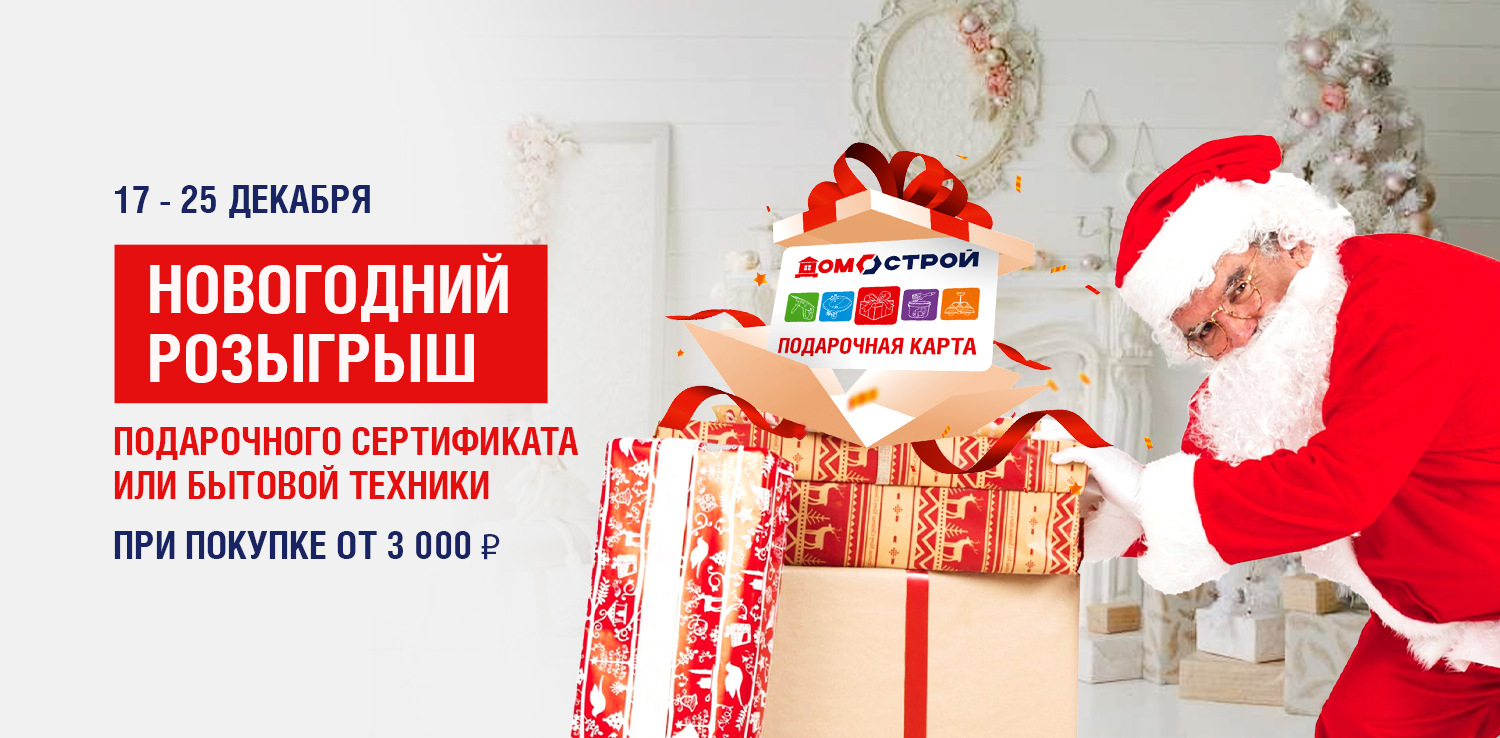 Новогодний розыгрыш в магазине ДомоСтрой в г. Красноуфимск, ул. 8 Марта, д. 78/2. С 17 по 25 декабря совершите покупку в магазине на сумму от 3 000 рублей с новогодним товаров в чеке и получите шанс выиграть подарочный сертификат или бытовую технику.